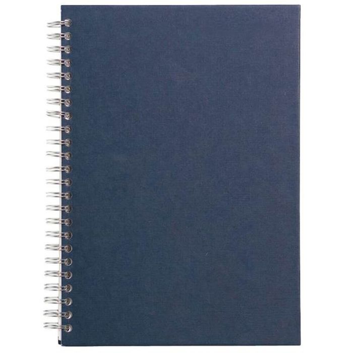 s linjerade anteckningbok med omslag i hård mörkblå kartong, med linnestruktur och dubbelspiral. Se till att ha flera olika block hemma för olika uppgifter.