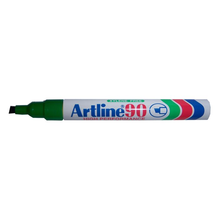 Märkpenna Artline 90 för permanent märkning på metall, glas, papper, plast, kartong, textilier mm. Vattenfast, bleks ej, snabbtorkande Pennkropp i aluminium Xylene fri Klarar både värme och kyla Spetsbredd 2-5 mm Snedskuren spets Förpackningen delas ej Finns i flera färger.
