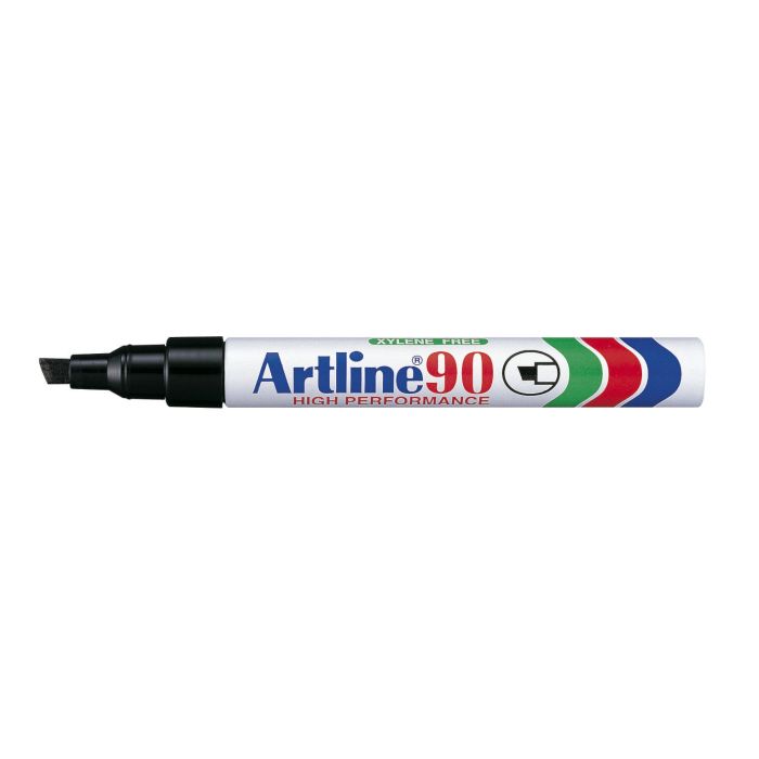 Märkpenna Artline 90 för permanent märkning på metall, glas, papper, plast, kartong, textilier mm. Vattenfast, bleks ej, snabbtorkande Pennkropp i aluminium Xylene fri Klarar både värme och kyla Spetsbredd 2-5 mm Snedskuren spets Förpackningen delas ej Finns i flera färger.