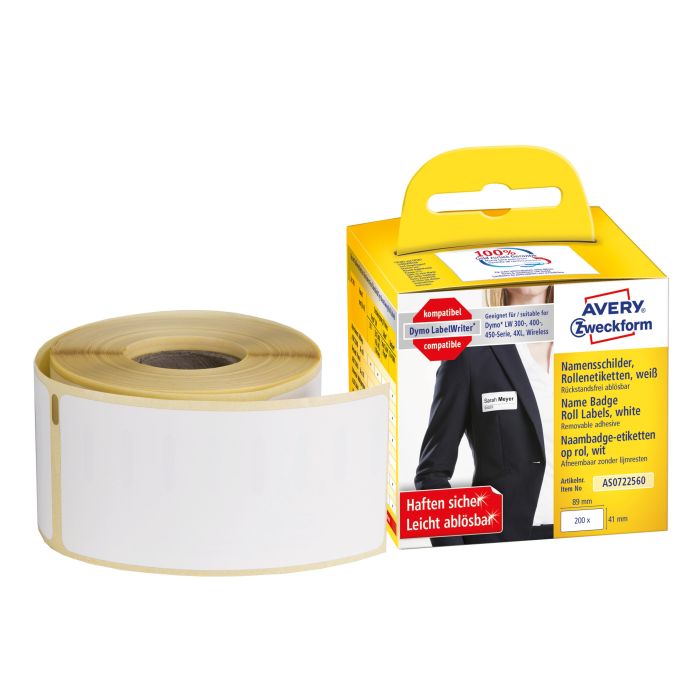 Med de självhäftande namnskyltarna är det enkelt att tydligt skriva ut namn och annan information så att du kan koncentrera dig på samtalet. Averys AS0722560 på rulle för etikettskrivare motsvarar DYMO® S0722560 och är 100 % kompatibla med DYMO® LabelWriter ™ LW310, LW330T, LW400 Serie, LW450 Series, 4XL och LW Wireless!