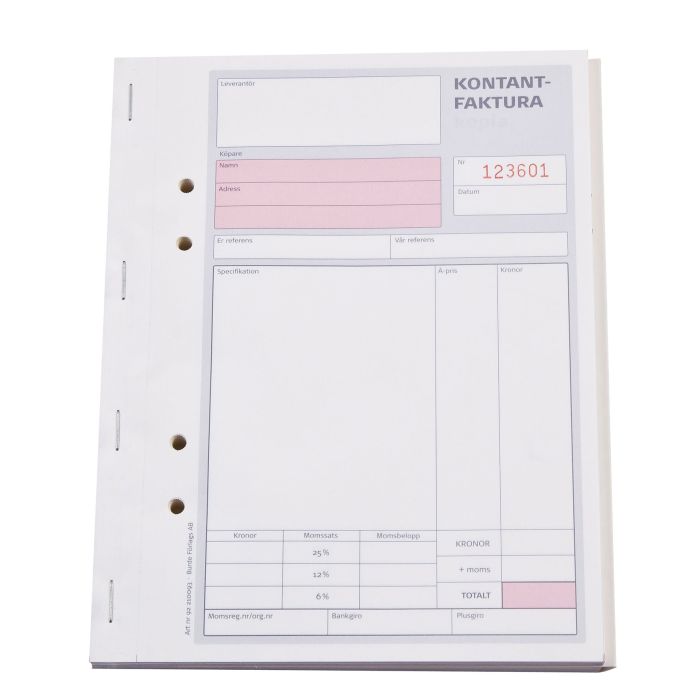 Kontantfakturablock med 2 kopior. Kontantfaktura är en vanlig faktura men den betalas på plats, samma dag som den skrivs ut.