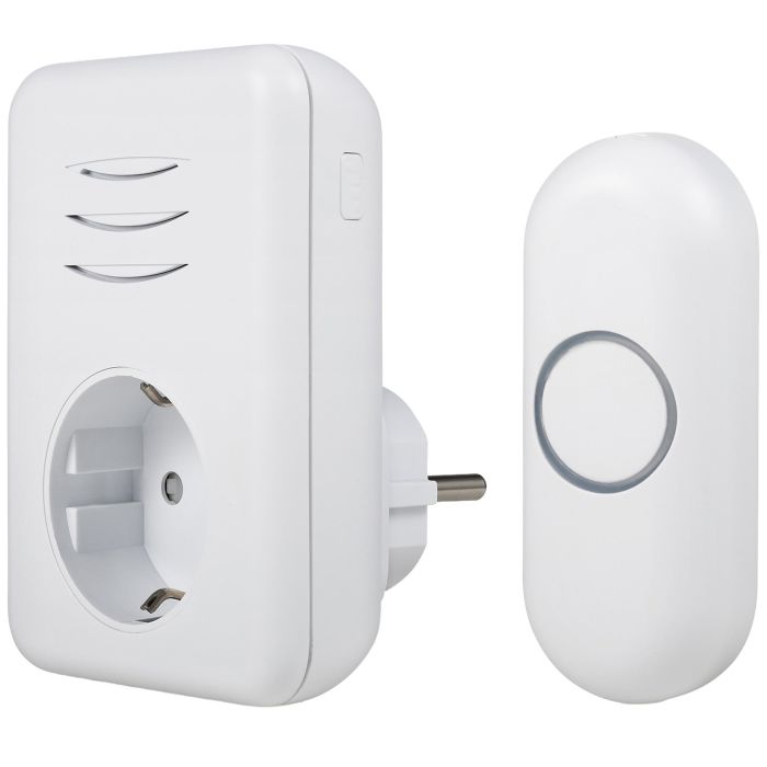 Den batteridrivna tryckknappen är enkel att montera vid dörren eller porten, och den smidiga plug-in-mottagaren kan användas i valfritt rum i hemmet. Dessutom har mottagaren ett inbyggt eluttag, så du förlorar inte någon kontakt när du ansluter dörrklockan.