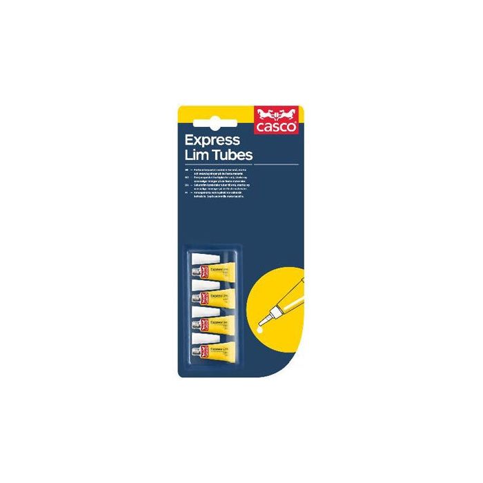 Kan användas för metall, porslin, keramik, gummi, styv plast, trä, kork, läder etc. Casco ExpressLim levereras i en 0,5 g praktisk tub, 4 stycken per förpackning.