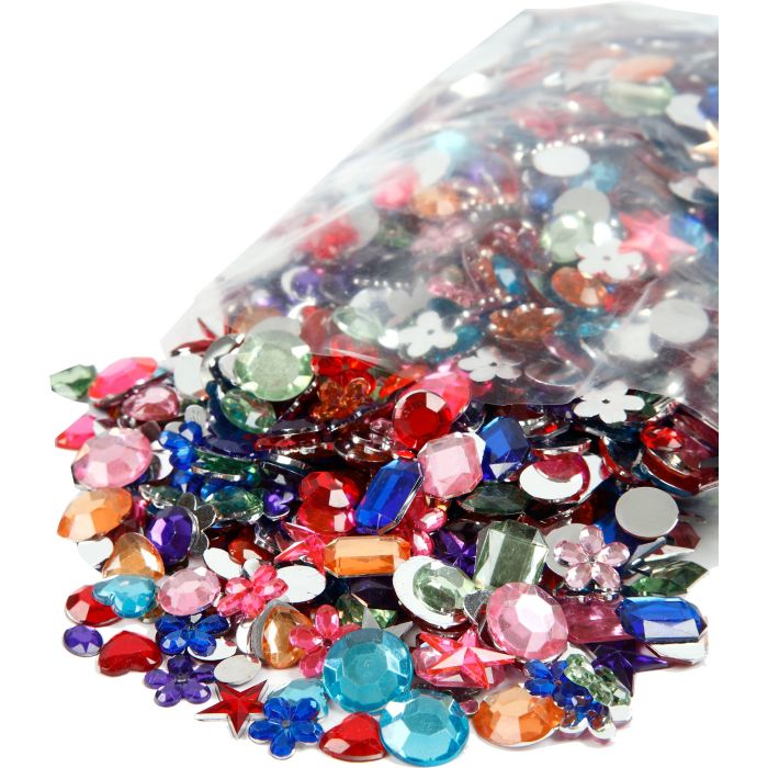 Sortiment med dekorationsstenar i mixade modeller och färger, med facettyta och platt baksida. Gör din vardag lite glittrigare!