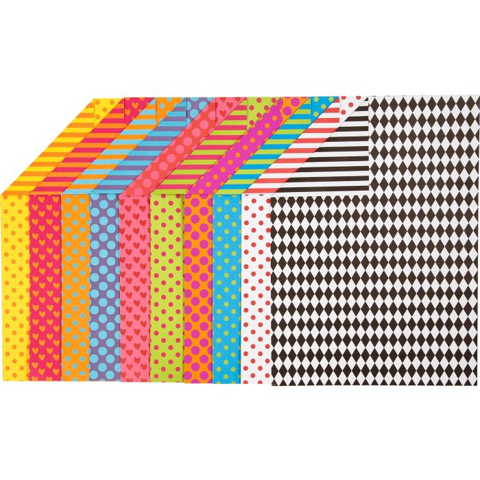 Mönstrad kartong i olika mönster och färger i A4-format. Pyssla och dekorera olika föremål med dessa mönstrade papper.