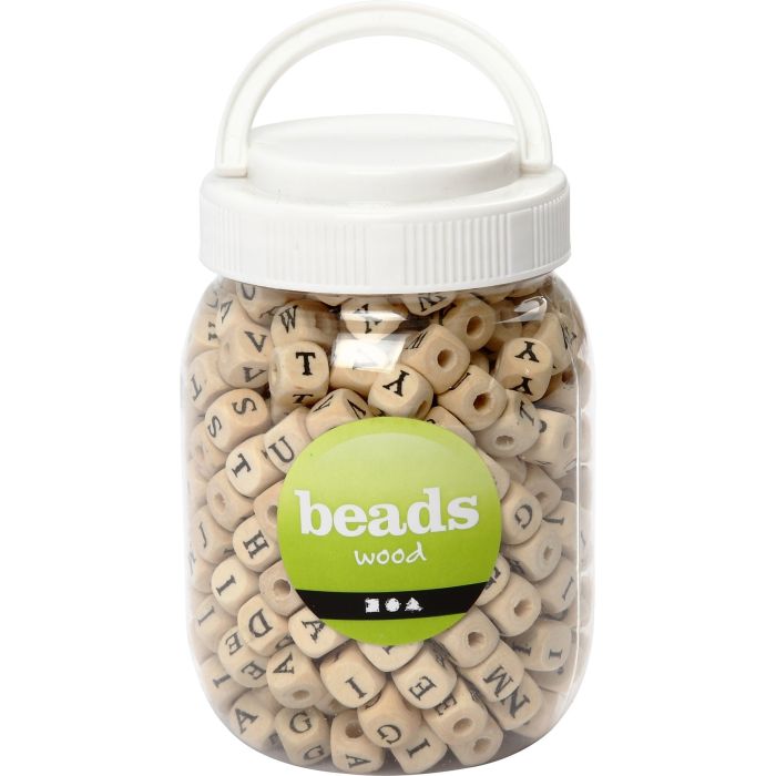 Naturfärgade träpärlor med bokstäver. Levereras i plastburk. Innehåller inte Å, Ä och Ö. CE-märkta. • Stl. 9x9x9 mm • Hålstl. 3 mm • Innehåll: ca. 400 st