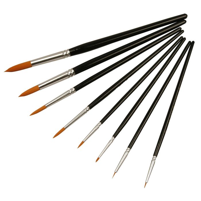 Sortiment av runda penslar i nylonhår med kort lackat skaft. Allroundpensel till både tunn/tjockflytande färger.