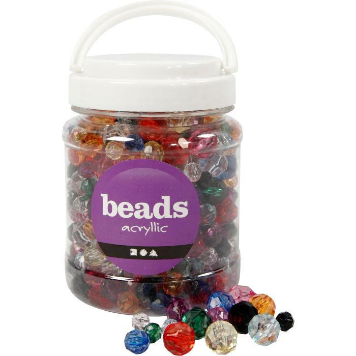 Facetterade plastpärlor. Exklusiva transparenta acrylpärlor i en kristallmix i fin A-kvalitet. CE-märkta. • Storlek: 10 - 12 - 16 mm • Hålstorlek: 1– 2,5 mm • Mixade färger • Ca: 440 st/fp mixade .
