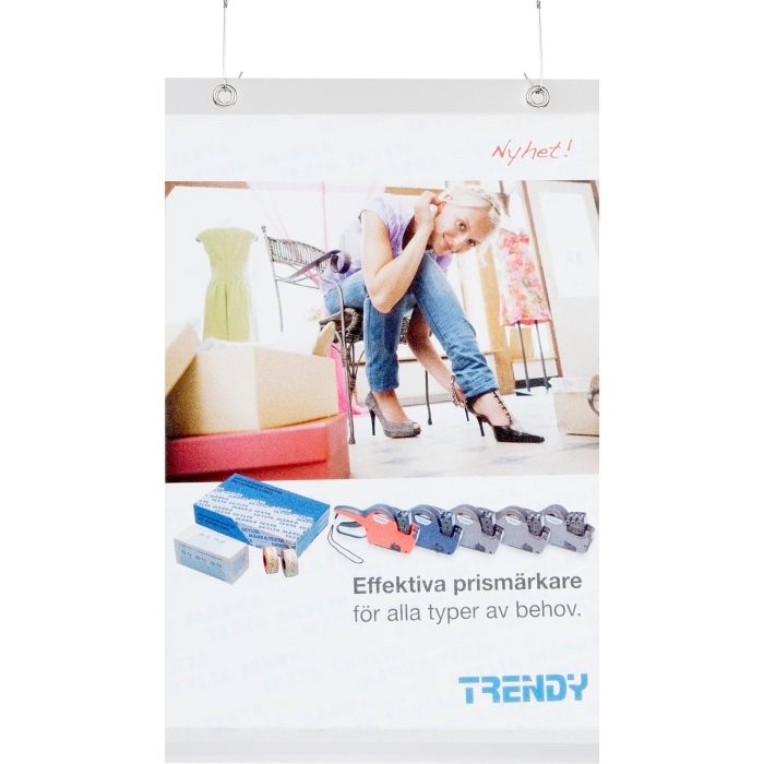 Funktionell frihängande plastfickan som har två hål i överkant vilket gör det lätt att hänga upp dem synligt när du vill informera om något som tex: i butiker, skolor mm. Hålen är förstärkta med öljetter för att fästa tråd eller skyltfjädrar (artikelnr: 2277950).