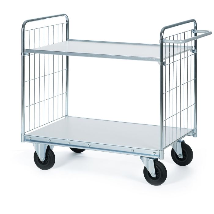 Vagn Ergobjörn utrustad med låga gavlar och 2 hyllor 120 x 60 cm. Tack vare två fasta och två länkhjul blir körningen stabil.