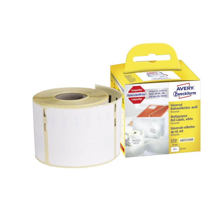Har du en DYMO® LabelWriter™ och saknar etiketter till den? Averys AS0722440 etiketter på rulle för etikettskrivare motsvarar DYMO® S0722440 samt är 100% kompatibel med DYMO® LabelWriter ™ LW310, LW330T, LW400 Serie, LW450 Series, 4XL, LW Wireless.