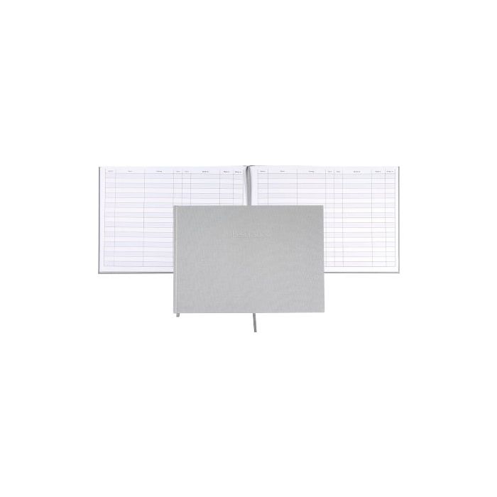 Inbunden besöksbok. Grå textilpärm med hårda sidor.