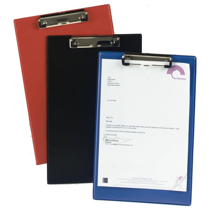Finns i flera färger Med upphängningshål 340 x 235 mm för A4 Metallklämma som håller papperna på plats Inkl pennhållare Klarar av ca 50 blad.