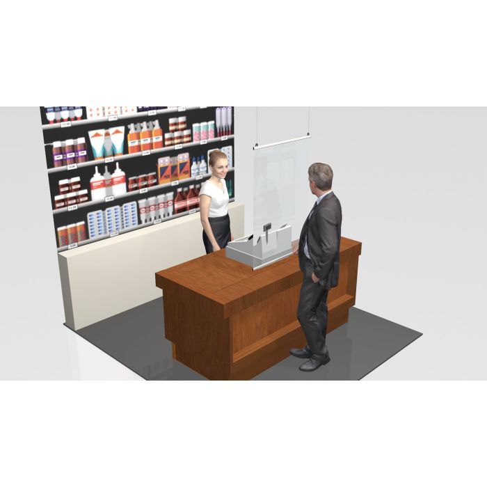Hängande skyddsskärm med elegant snäpp-profil i aluminium som håller skyddsplasten säkert på plats, stående eller liggande format. Förhindrar spridning av virus och bakterier, tex Covid-19 och gör arbetet säkrare.