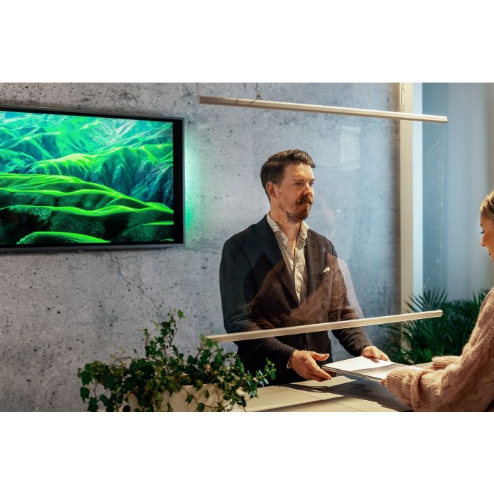Hängande skyddsskärm med elegant snäpp-profil i aluminium som håller skyddsplasten säkert på plats, stående eller liggande format.