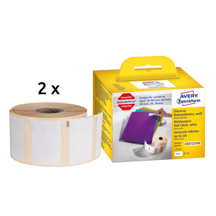 Saknar du etiketter till din DYMO® LabelWriter™? Averys AS0722540 avtagbara etiketter på rulle för etikettskrivare motsvarar DYMO® S0722540 och är 100% kompatibel med DYMO® LabelWriter™ LW310, LW330T, LW400 Serie, LW450 Serie, 4XL, och LW Wireless!