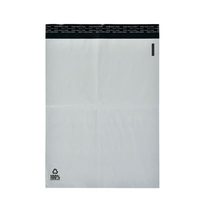 E-handelspåsar – postorderpåsar med handtag i vit plast för emballering av exempelvis kläder, textilier m.m. Tillverkade av helt eller delvis återvunnen plast.