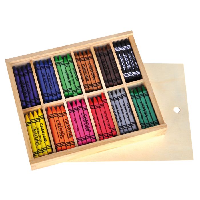 Crayons vaxkritor i trälåda med 12 fack och lock. Enkelt att hålla reda på kritorna mellan rit tillfällena och samtidigt gör det inget om lådan skulle vändas upp och ned.