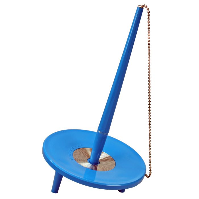 Står stadigt med gummifötter. Den klassiska sneda hållaren som synliggör pennan och som är fäst med en metallkedja till hållaren, vilket gör att bordspennan aldrig försvinner.