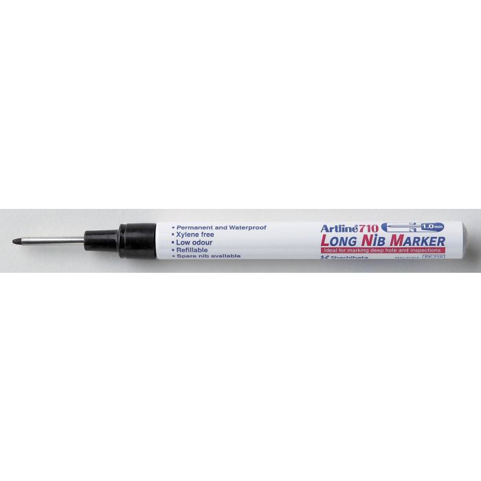 Märkpenna Artline 710 Long Nib med 30 mm stålrörförstärkt akrylfiberspets. Idealisk för markering i djupa svårtillgängliga utrymmen - ex: hål, som t ex vid uppsättning av skenor eller konsoller..