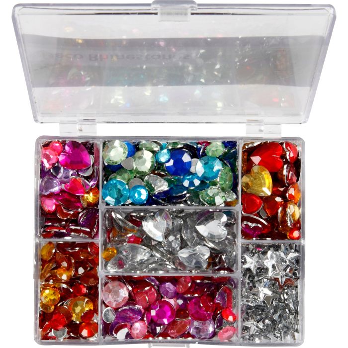 Blandade rhinstenar med platt baksida. Totalt 3 designer à flera storlekar och färger i klar ask med praktisk fackindelning och lock.