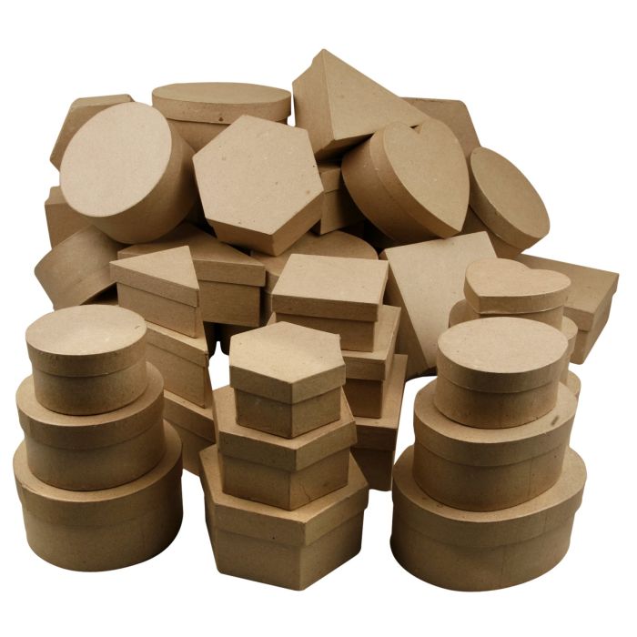 Handgjorda papier machéaskar med lock i 4 olika former och 3 olika storlekar. Lämpliga för dekoration och målning.