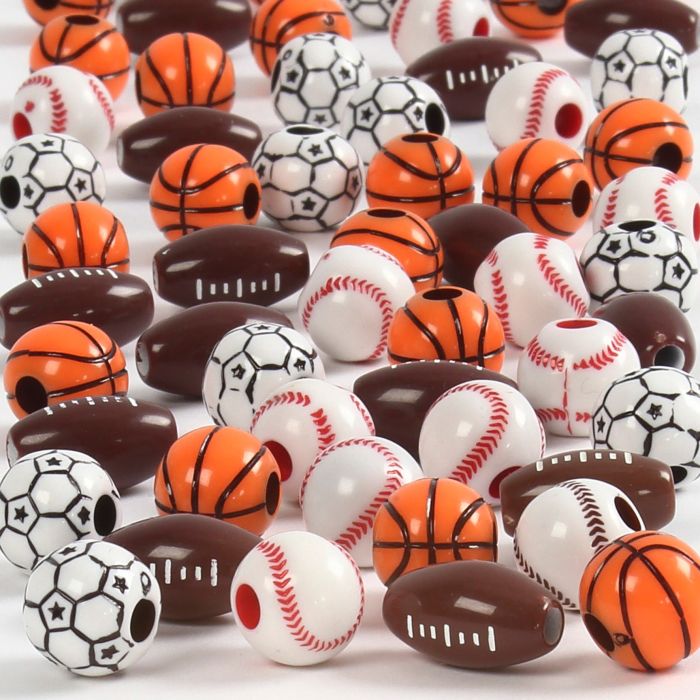 Mix av runda plastpärlor formade som olika bollar inom olika sporter, präglade, karakteristiska detaljer (fotboll, rugby, basket och baseboll). CE-märkta. • Ø 11–15 mm • Hålstorlek: 3–4 mm • Mixade färger • Ca: 220 st/fp • Miljöinfo: Vattenbaserat .