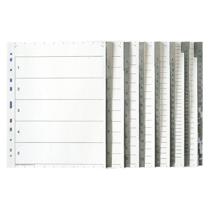 Avdelare underlättar organisering. Av 120g papper med plastförstärkta grå flikar.