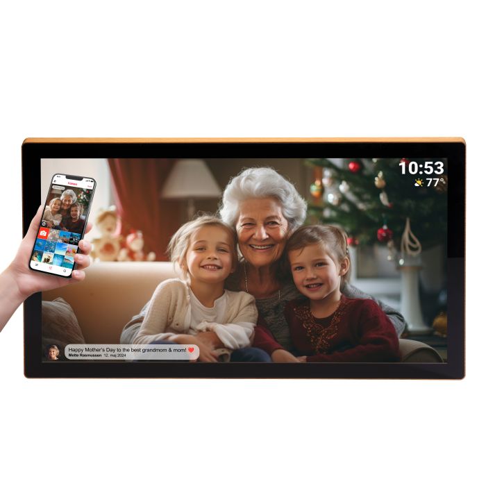 Du kan också föra över bilder med MicroSD-kort. Familjemedlemmar och vänner kan också skicka sina egna bilder till skärmen, och lägga till text som berättar om dina fotominnen.
