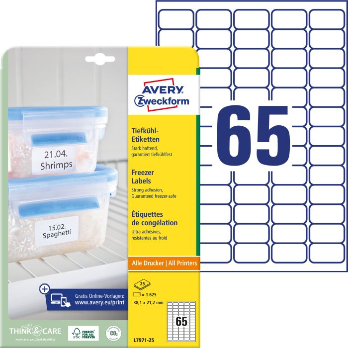Frysetiketter idealiska för märkning och organisering av kyl- och frysvaror i kylrum och frysar där man behöver synlig och tydlig information om hållbarhet m.m. Med frysetiketterna från Avery får du en hållbar märkning som också kan spara dig tid eftersom innehåll och annan varuinformation är tydlig både under infrysning och efter upptining. Etiketterna är främst avsedda för frys- och fiskeindustrin, slakterier, gårdsbutiker, laboratorier och sjukhus, men kan naturligtvis också användas i hemmet.