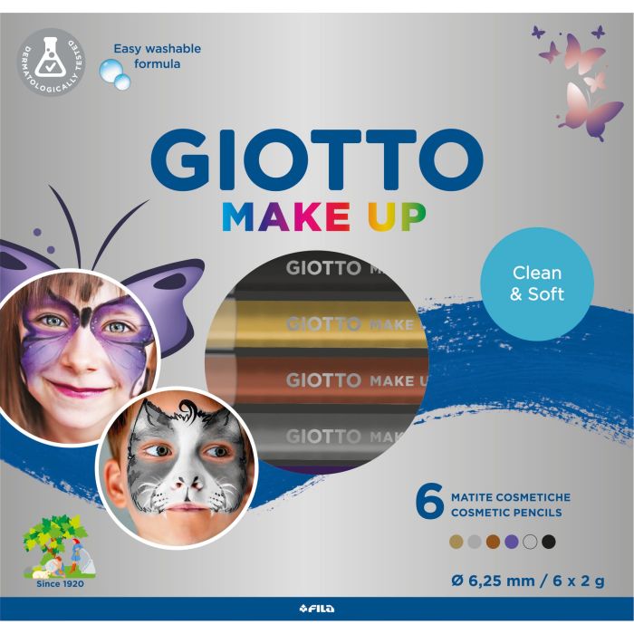 6 kosmetiska pennor för ansiktsmålning i klassiska bas eller metall färger från Giotto, specialdesignade för kreativ ansiktsmålning. Kosmetisk penna med ny mjukare formulering och lätt tvättbar från huden.