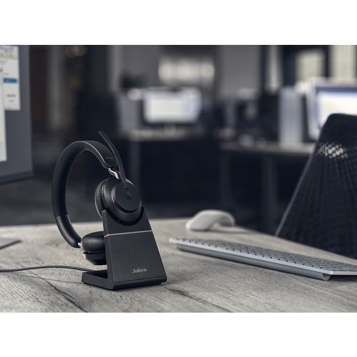 Jabra Evolve2 65. Professionellt bluetooth-headset inklusive praktiskt laddställ.