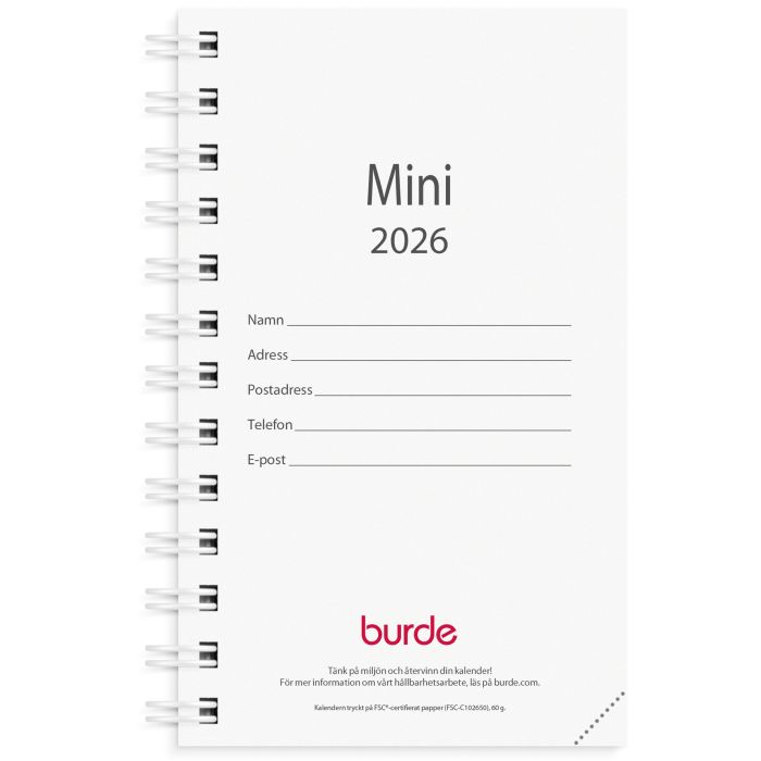 --Kalender 2026 från Burde --Format: 63x107 mm --Layout: Liggande --Vecka/uppslag --Kalendarium: 2025-11-10–2027-01-03 --Omslag: Kartong --Spiralbunden --Innehåll: Flaggdagar, Helgdagar/aftnar, Månfaser, Namnsdagar, Internationella helgdagar översikt, Temadagar/händelser, Årsöversikt/årsöversikter.