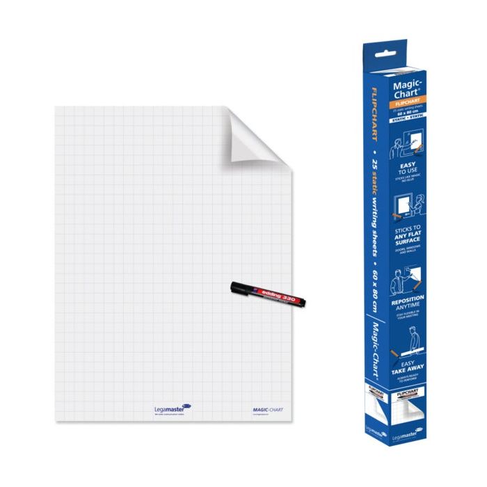 Blädderblock Legamaster Magic Chart, statisk skrivfilm i polypropylen, fäster på alla underlag (betong, glas, tapet, trä etc), fördelen att den inte behöver något blädderblocksställ utan man sätter upp detta statiskt laddade papper där man vill. Perfekt för brainstorming och andra typer av möten.