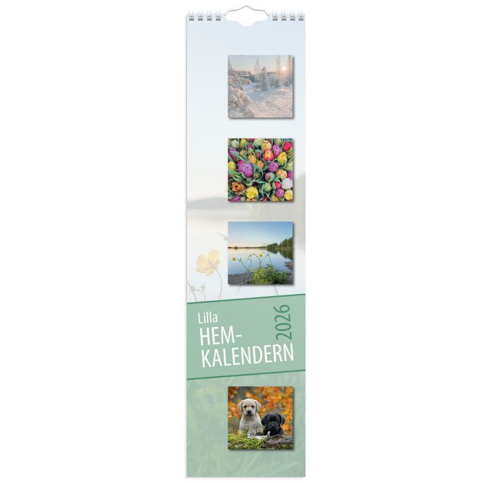 Lilla Hemkalendern i väggformat från Burde. En månad per dag, spiralbunden. --Väggkalender 2026 från Burde --Format: 110x430 mm --Layout: Månad/blad. Spiralbunden. --Kalendarium: 2026-01-01–2026-12-31 --Innehåll: Kyrkliga helgdagar, Flaggdagar, Helgdagar/aftnar, Månfaser, Namnsdagar, Temadagar/händelser. --Antal sidor: 12 --Miljöinformation: FSC®