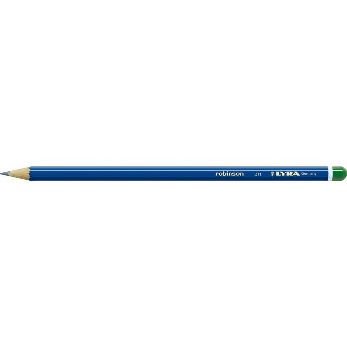 Blyertspenna Robinsson från Lyra – hexagonal, lackad i blått med färgad ände för att indikera hårdhetsgraden. Finns i 9 hårdhetsgrader (6B–4H).