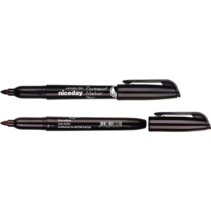 Permanent märkpenna Niceday med ljuståligt och vattenfast bläck. För märkning av de flesta ytor såsom glas, trä, metall, textil, plast. Tillverkat av returmaterial PP-plast. -- Svart -- Xylenfri -- Alkoholbaserat bläck -- Skrivbredd: 1 mm -- Rund spets -- Förpackning delas ej -- Miljöinfo: Tillverkad av 70% returplast PP