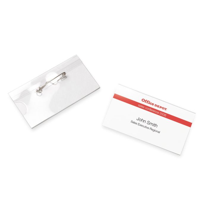 plastfickor för ID-kort, visitkort som namnskyltar i transparent plast för kontoret, möten, konferenser och seminarier med nål och/eller klämma. Inklusive vit instick på perforerad remsa - för textning Liggande Finns i flera olika storlekar Miljöinfo: Tillverkat av Polypropylenplast (PP).