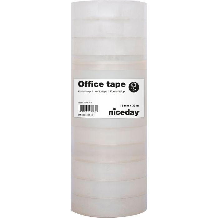 Kontorstejp Niceday är en allroundtejp för kontor, skola och hushåll. Klar polypropylen Bredd: 15 mm Innerdiameter (för hållare): Rullar med 10/33 meter: 25 mm Innerdiameter (för hållare): Rullar med 66 meter: 75 mm Förpackningen delas ej.