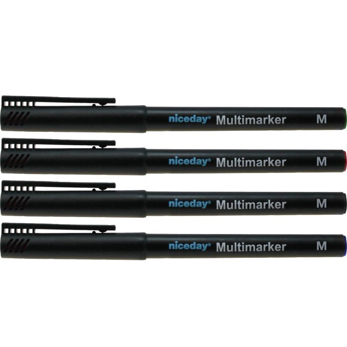 Permanent märkpenna Niceday Multimarker för de flesta tuffa ytor som plast, glas, overheadfilm mm. • Finns i bredderna: Super fin 0,4mm, Fine, 0,8mm, Medium 1,0mm • 4-set innehåller: Pennor i färgerna - Röd, Blå, Grön, Svart • Xylenfri • Förpackningen delas ej
