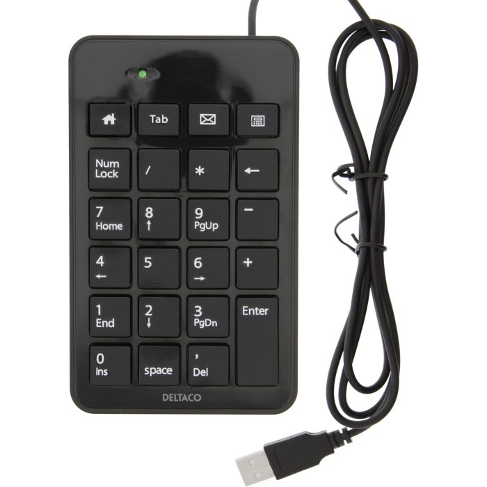Numeriskt trådat tangentbord, Deltaco. Smidigt numeriskt tangentbord med totalt 23 tangenter och 4 snabbknappar (Hem, Tab, E-mail och Kalkylator). -- Svart -- Mått (BxDxH): 90 x 150 x 15 mm -- Vikt: 95 g