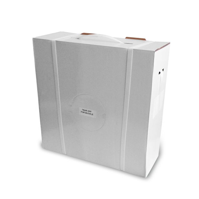 Komplett förpackning med VG-band i vit polyester samt metallspännen. VG-band är ett mjukt men mycket starkt band.