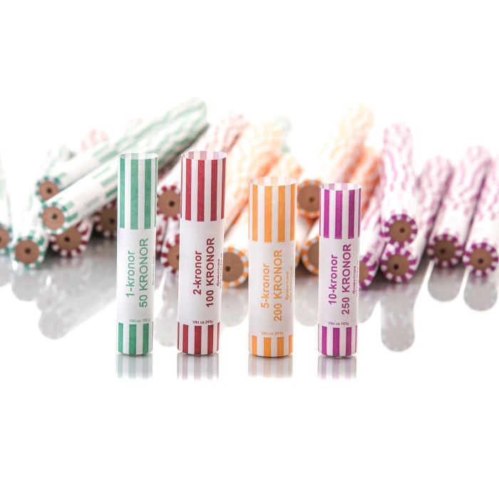 Mynthylsa / myntrör i papper för de olika valörerna. Enkelt att räkna alla mynt när de är sorterade och placerade i rätt rör.