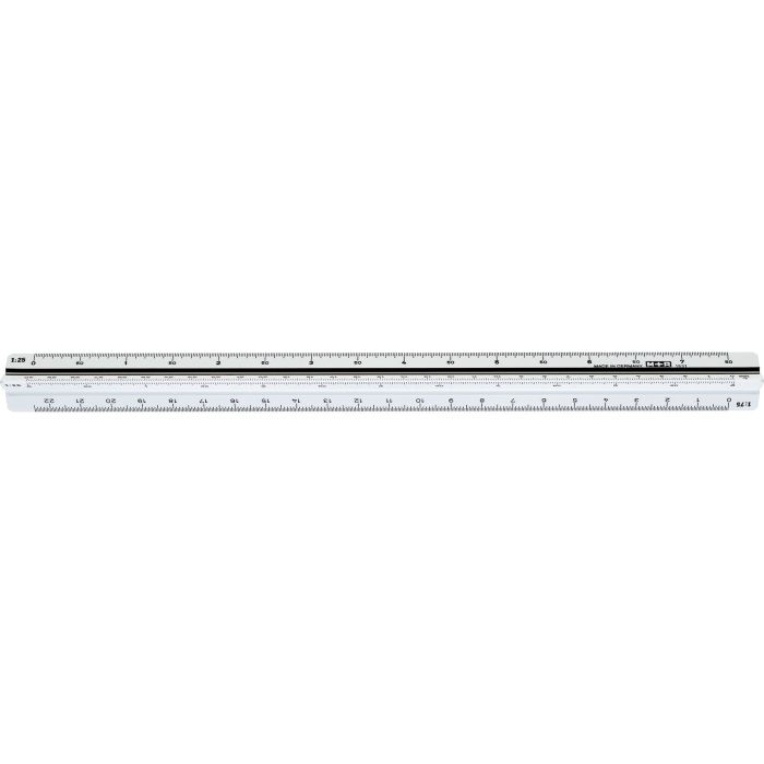 3-kantig skallinjal med 6 skalor med tydlig gradering, med olika skalor för mätning på ritningar och kartor. Levereras i ett skyddande plastetui.