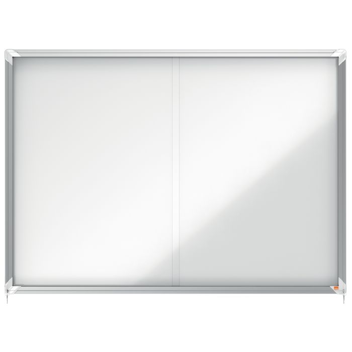 Anslagstavla låsbar med skjutdörr och magnetisk. Magnetiskt låsbart anslagstavla med skjutbara glasdörrar och diskret integrerat hörnlås.