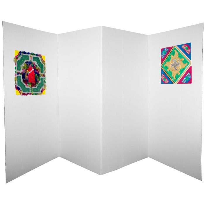 Vit stabil och hållbar utställningsskärm i 5 mm dubbelwell. Utmärkt för att fästa bilder och diverse annan info. Ihopvikningsbar i 4 sektioner om 90 cm/sektion. • Höjd: 190 cm • Total skärmbredd: 360 cm