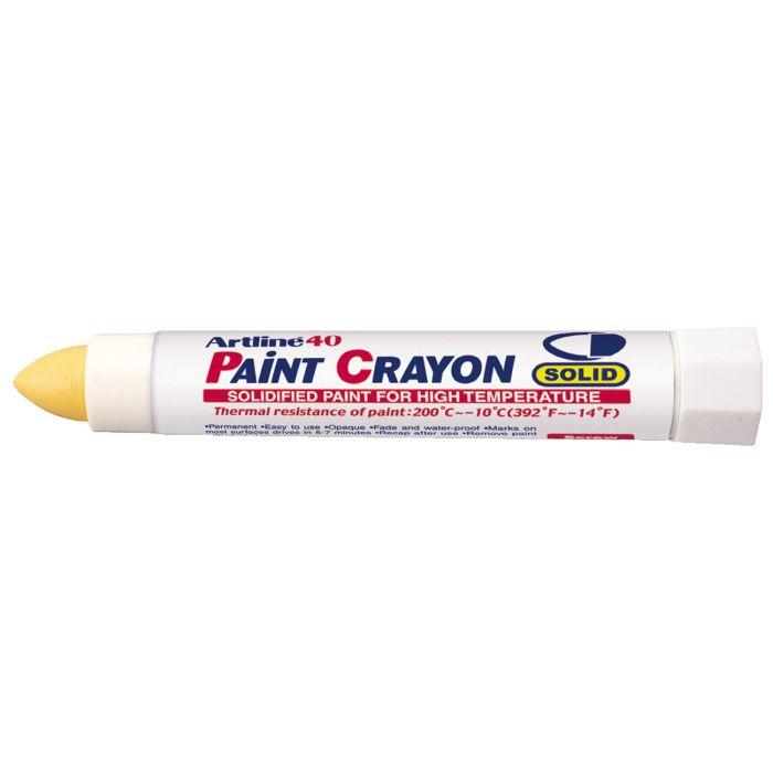 Permanent märkpenna Artline 40 Paint Crayon med kraftigt täckande färg. Denna solida penna är lämplig inom industrier som kräver permanetmärkning och används på föremål som utsätts för höga temperaturer. Bläcket klarar utav värme upp till 200°C och i kyla ner till –10°C.