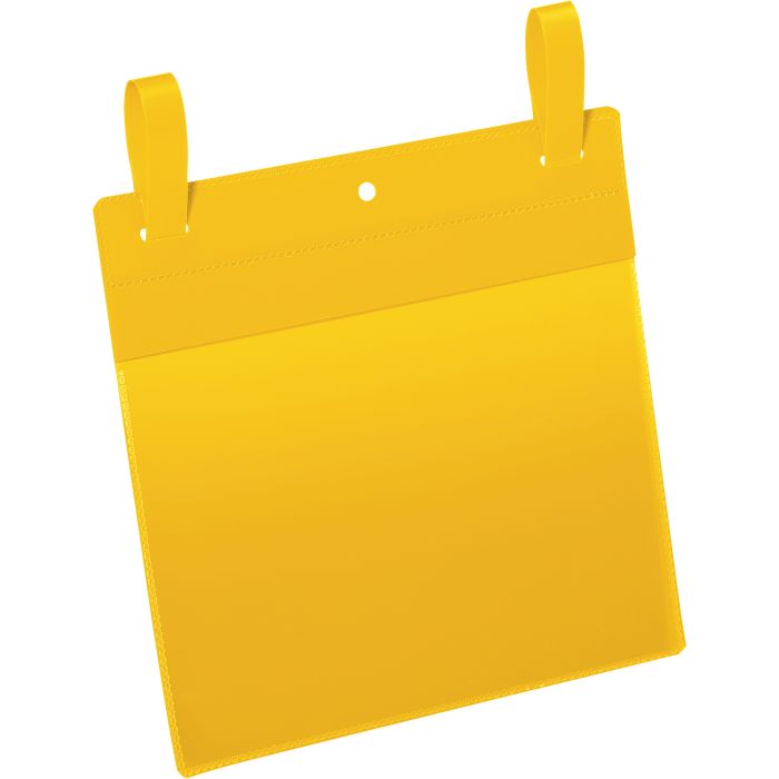Plastfickorna av slitstark polypropylene går att läsa med skanner. Ett lock gör att inlagan skyddas mot smuts och fukt även utomhus. Fästs med två pilformade band som träs igenom hålen i fickans överkant och sitter sedan ordentligt fast på gallret. Gratis mall för etiketten finns på www.duraprint.se. -- Gul -- Innermått: A5L (210x148 mm B x H) -- Yttermått: 223x387 mm (B x H) -- 50 st/fp