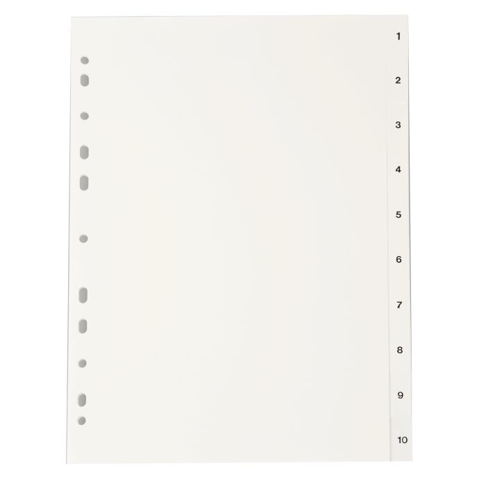 Office Depots praktiska A4 pärmregister utan försättsblad tillverkade av vit PP-plast. Multihålade för pärm och utan försättsblad. Svarta fliktryck som ger dig en bra översikt.