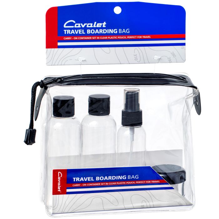 Cavalet reseflaskor – avsedda för att ta med vätska i kabinen på flyget. Flaskorna ligger i en transparent plastnecessär med dragkedja. --Två 100 ml flaskor --En 60 ml pumpflaska --En 25 ml burk för kräm etc